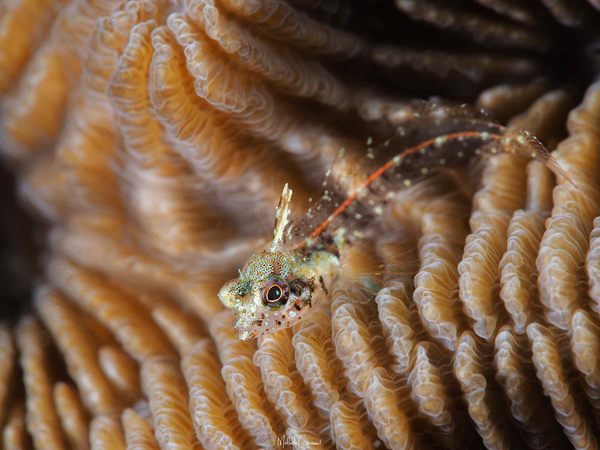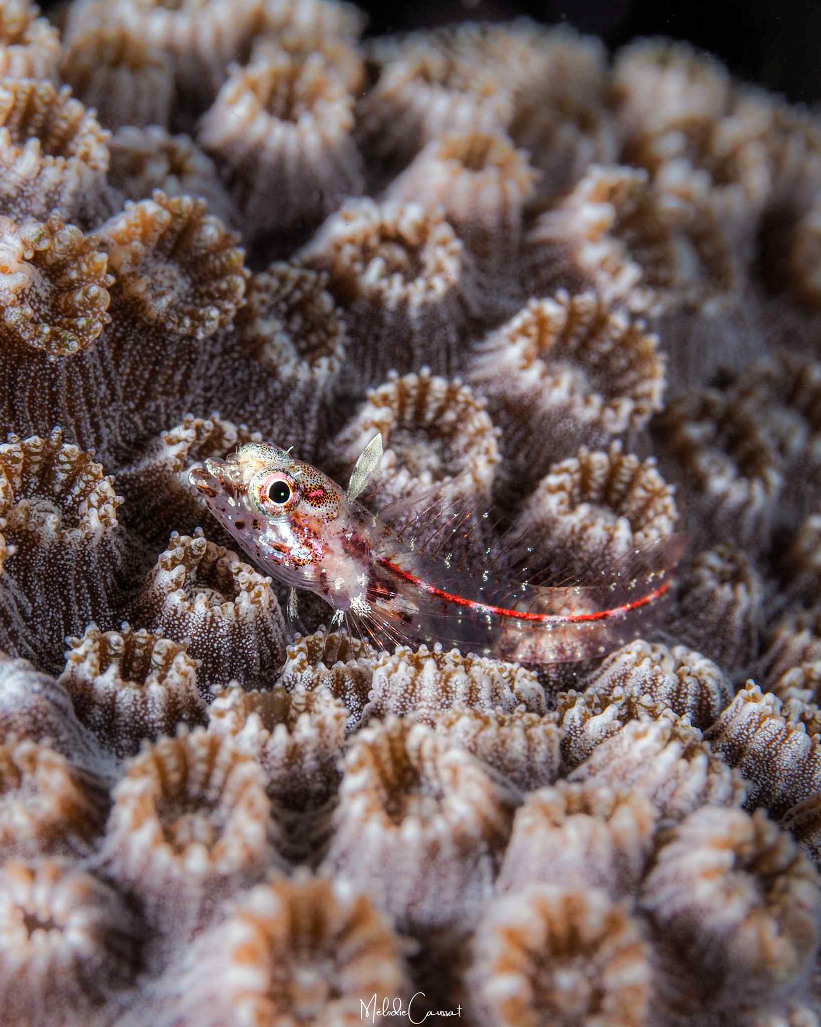 Immature males: dark purple/red with a green patch between eyes. Dark red vertebral column. Front of dorsal fin with some dark grey.
